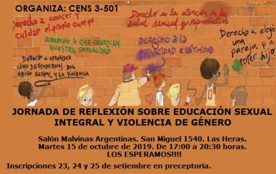 El martes 15 de octubre, en el salón cultural “Malvinas Argentinas” de la Municipalidad de Las Heras se realizaron las primeras Jornadas de concientización sobre Educación Sexual Integral y Violencia de Género, organizadas por el CENS 3-501.