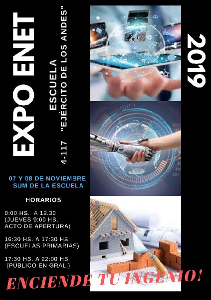 Durante el jueves 7 y viernes 8 de noviembre, en el Salón de Usos Múltiples de la escuela 4-117 “Ejército de Los Andes”,de San Rafael, se realizó la XXVI edición de la EXPO ENET, muestra en la cual los estudiantes de 6º año expusieron, ante alumnos de escuelas primarias y público en general, 23 proyectos innovadores: 19 trabajos de Electromecánica y cuatro de Construcciones.